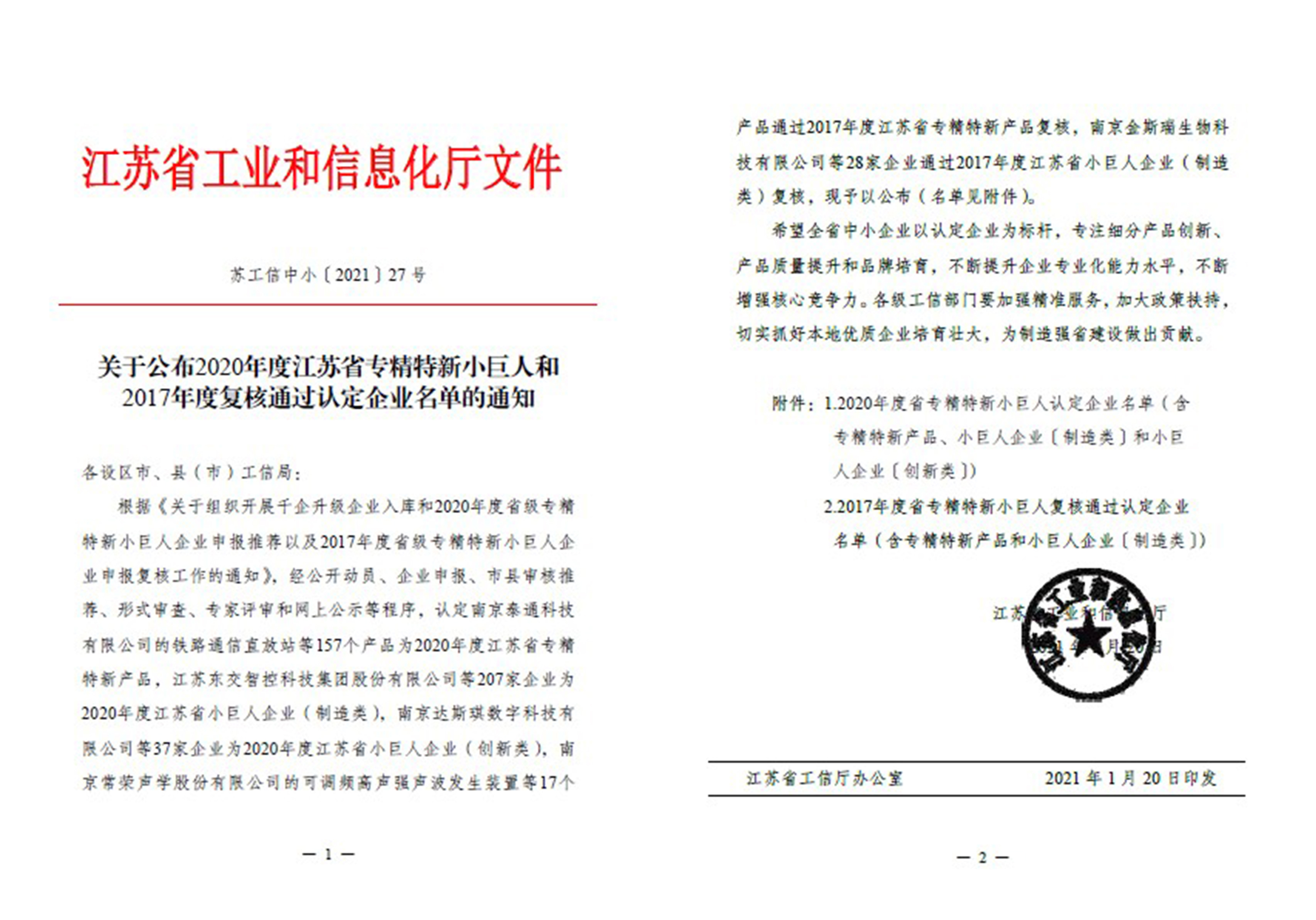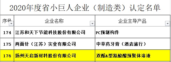 2021年1月扬州天启新材料股份有限公司通过了2020年度江苏省专精特新小巨人认定。
