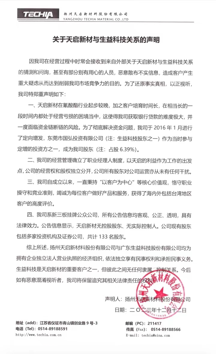 关于天启新材与生益科技关系的声明