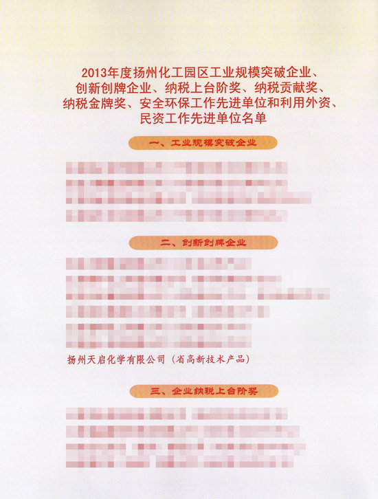 近日,扬州化工园区依据相关考核、激励办法对园区三十多家企业进行考核评定,我公司在评选活动中脱颖而出,荣获"2013年度扬州化工园区创新创牌企业"称号,并受到了表彰奖励。